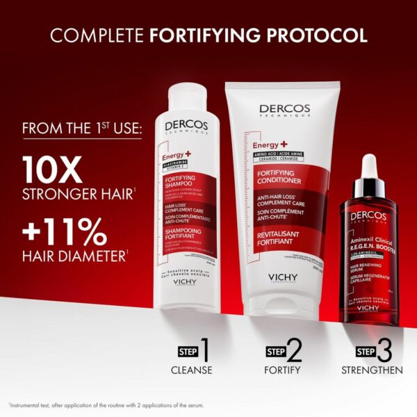 DERCOS AMINEXIL CLINICAL R.E.G.E.N. marki Vichy to suplement diety w formie serum 90 ml, stworzone specjalnie do wzmacniania słabych włosów i przeciwdziałania ich wypadaniu. Formuła zawiera aktywne składniki, takie jak aminexil (pochodna piroktonu olaminy), znany ze swoich właściwości przeciw wypadaniu, oraz ekstrakt z imbiru, który stymuluje regenerację włosów poprzez poprawę krążenia skóry głowy. Zawiera także propylene glycol i water (aqua), które zapewniają odpowiednią konsystencję i wchłanianie produktu. Preparat jest przeznaczony do użytku uniwersalnego i dostępny w formie z dozownikiem, co ułatwia higieniczną i precyzyjną aplikację. Pochodzące z Hiszpanii i Francji serum oferuje specjalistyczną pielęgnację, która wzmacnia strukturę osłabionych włosów, zwiększając ich gęstość i odporność na czynniki sprzyjające wypadaniu. Formuła jest odpowiednia dla wszystkich osób poszukujących skutecznego wsparcia w codziennej pielęgnacji włosów, nie zawiera ochrony przeciwsłonecznej (SPF), ale zawiera składniki aktywne działające na poziomie biologicznym dla poprawy zdrowia mieszków włosowych. Produkt stanowi zaawansowane rozwiązanie w gamie DERCOS marki Vichy, znanej z klinicznego podejścia do pielęgnacji skóry głowy. Podsumowując, DERCOS AMINEXIL CLINICAL R.E.G.E.N. to profesjonalna opcja dla osób potrzebujących wzmocnienia włosów osłabionych, z wyselekcjonowanymi składnikami i wygodną formą, gwarantującą praktyczną aplikację oraz efekty w postaci zmniejszenia wypadania i regeneracji włosów.