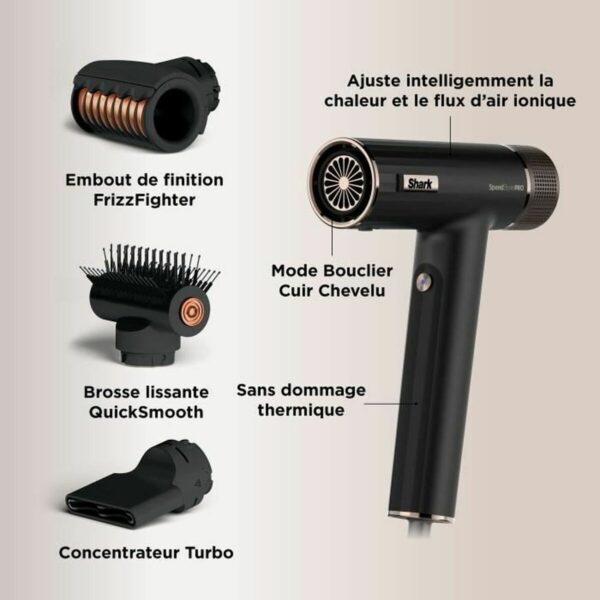 Suszarka do włosów Shark HD731EU SpeedStyle Pro 3 w 1 w kolorze czarnym oferuje wydajną pracę dzięki mocy 1750 W, idealną do szybkiego i precyzyjnego suszenia włosów na co dzień. Model ten został zaprojektowany z myślą o bezpieczeństwie i komforcie użytkownika, wyposażony w ochronę przed przegrzaniem, która zapobiega uszkodzeniom urządzenia i włosów, wydłużając żywotność sprzętu i gwarantując niezawodne użytkowanie. Obrotowy kabel 360º ułatwia manewrowanie podczas suszenia, zapobiegając plątaniu i zapewniając większą swobodę ruchów, co jest kluczowe dla wygodnej i ergonomicznej obsługi w każdej sytuacji. Koncepcja 3 w 1 sugeruje wszechstronność zastosowań, łącząc funkcje suszenia, stylizacji lub specjalistycznych zabiegów, co zwiększa wartość tej suszarki w swojej klasie. Shark, marka znana z praktycznych i funkcjonalnych produktów, oferuje w tym modelu suszarkę zrównoważoną pod względem mocy, bezpieczeństwa i ergonomii, dostosowaną zarówno do użytku domowego, jak i profesjonalnego, zapewniającą łatwe osiągnięcie efektów bez komplikacji. Suszarka ta łączy kluczowe cechy techniczne dla osób poszukujących funkcjonalności i skutecznej ochrony w kompaktowym i łatwym w obsłudze urządzeniu.